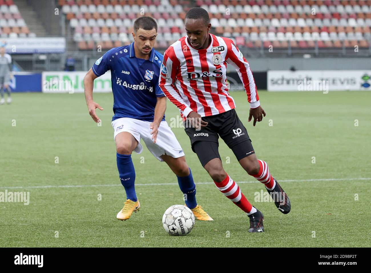 Rotterdam Netherlands November 01 L R Oliver Batista Meier Of Sc Heerenveen And Emmanuel Emegha Of Sparta Rotterdam During The Dutch Eredivisie Match Between Sparta Rotterdam And Sc Heerenveen At Het Kasteel